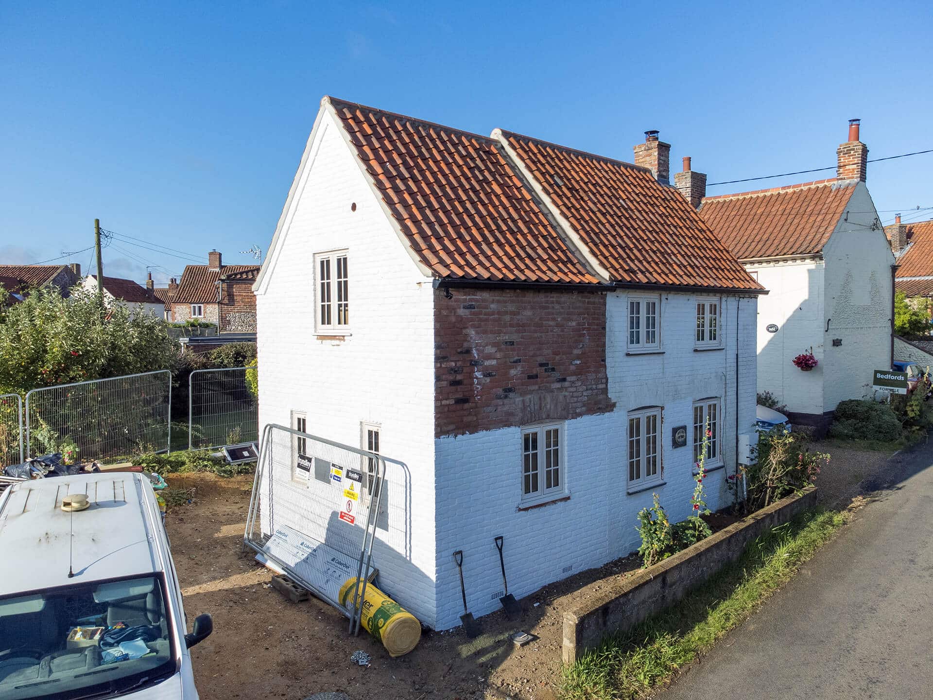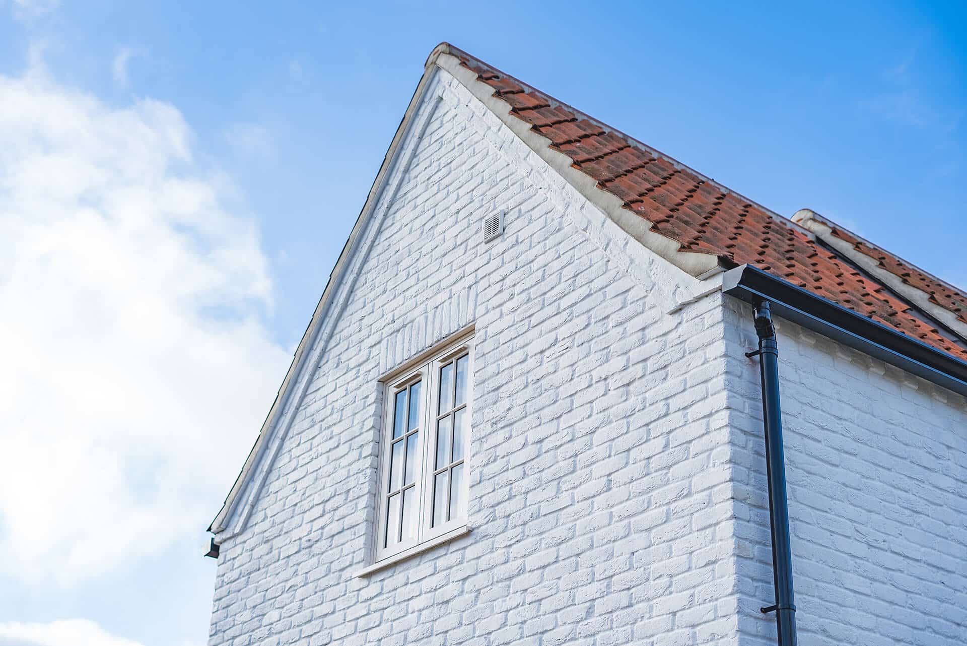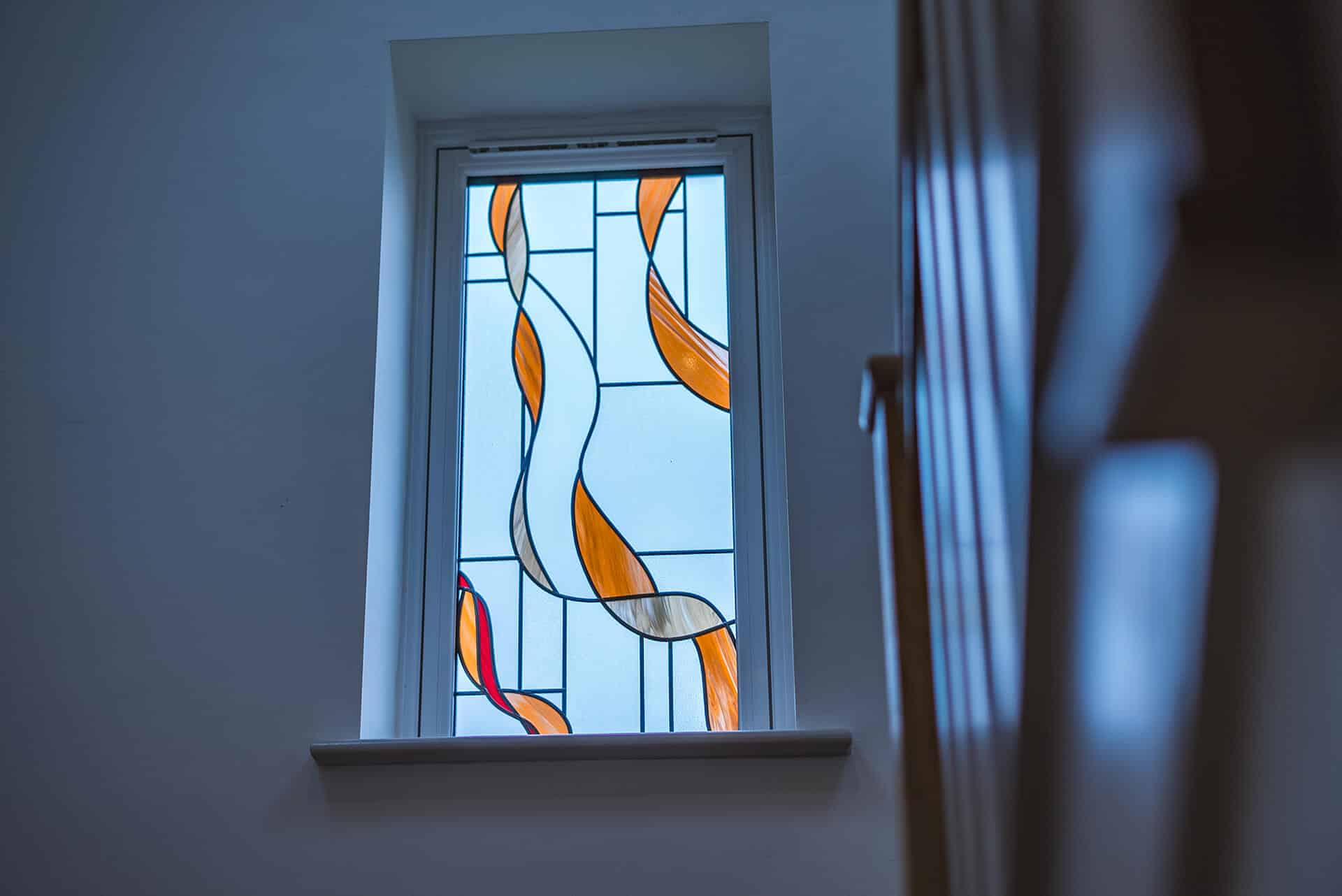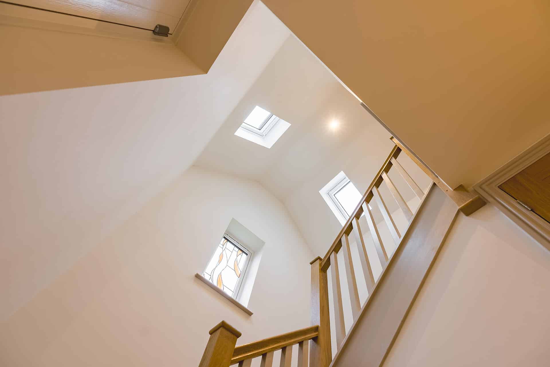 At the point we arrived on site, the foundations, external walls, timber first floor structure, and timber roof structure of the extension had been constructed. After some snagging associated to the elements undertaken by the previous contractor, we were then ready to push on with the remaining scope of works. A high level lift of scaffolding was put in place so we had safe access to the roof, which was closed in using a waterproof membrane and roof tiles that match the existing house. This scaffolding was then altered as we moved down the building, painting the external walls in white to again match the original house. At the same time, we replaced all of the windows and external doors to the property, including a beautiful stained-glass window situated on the staircase.