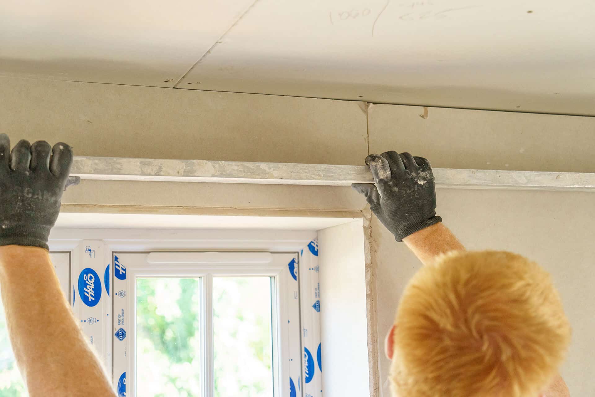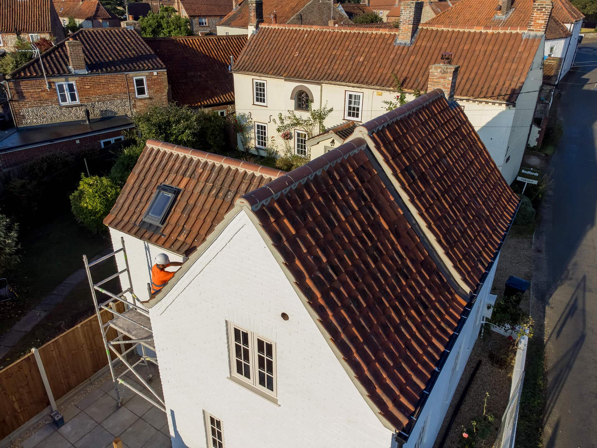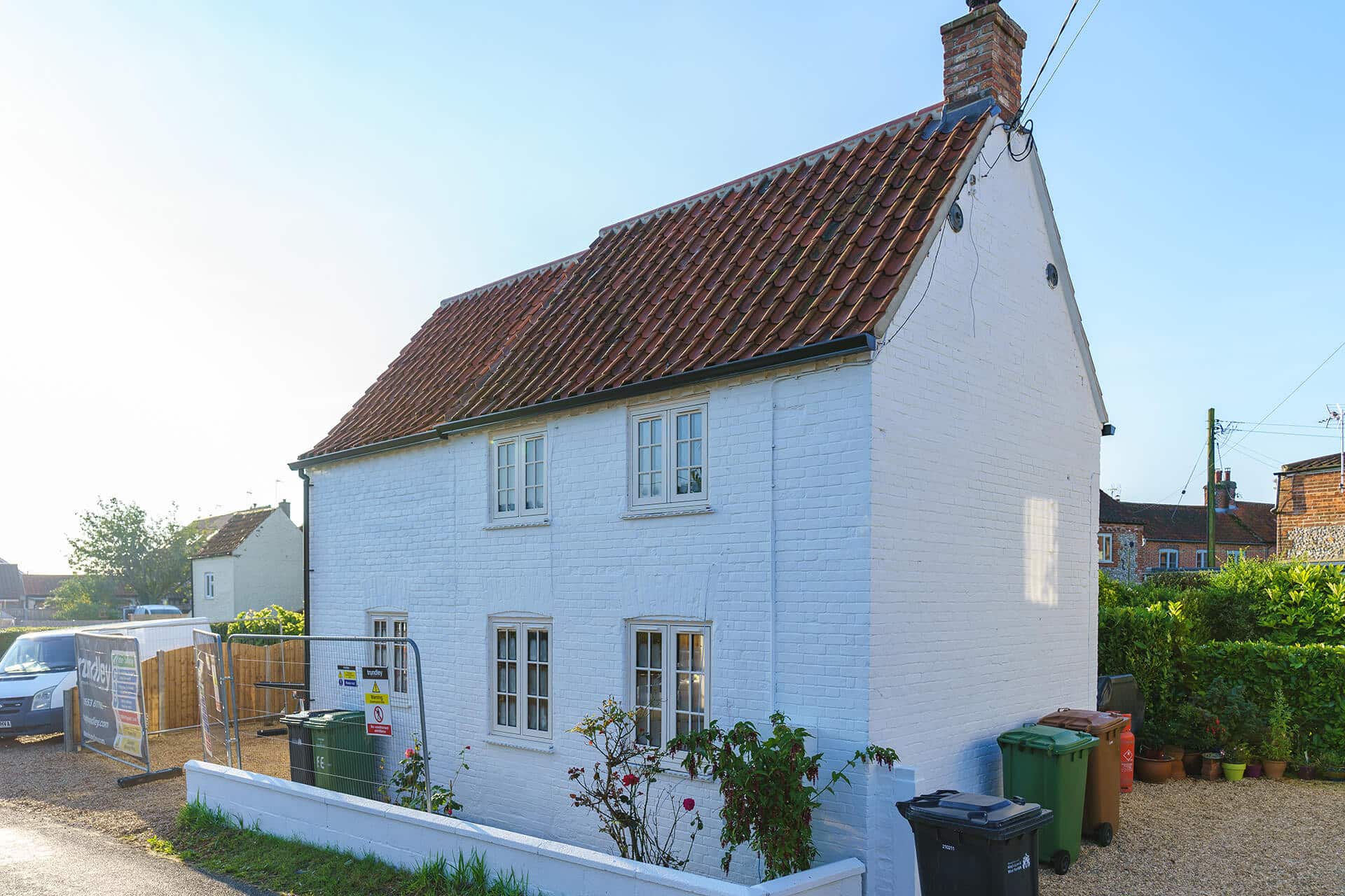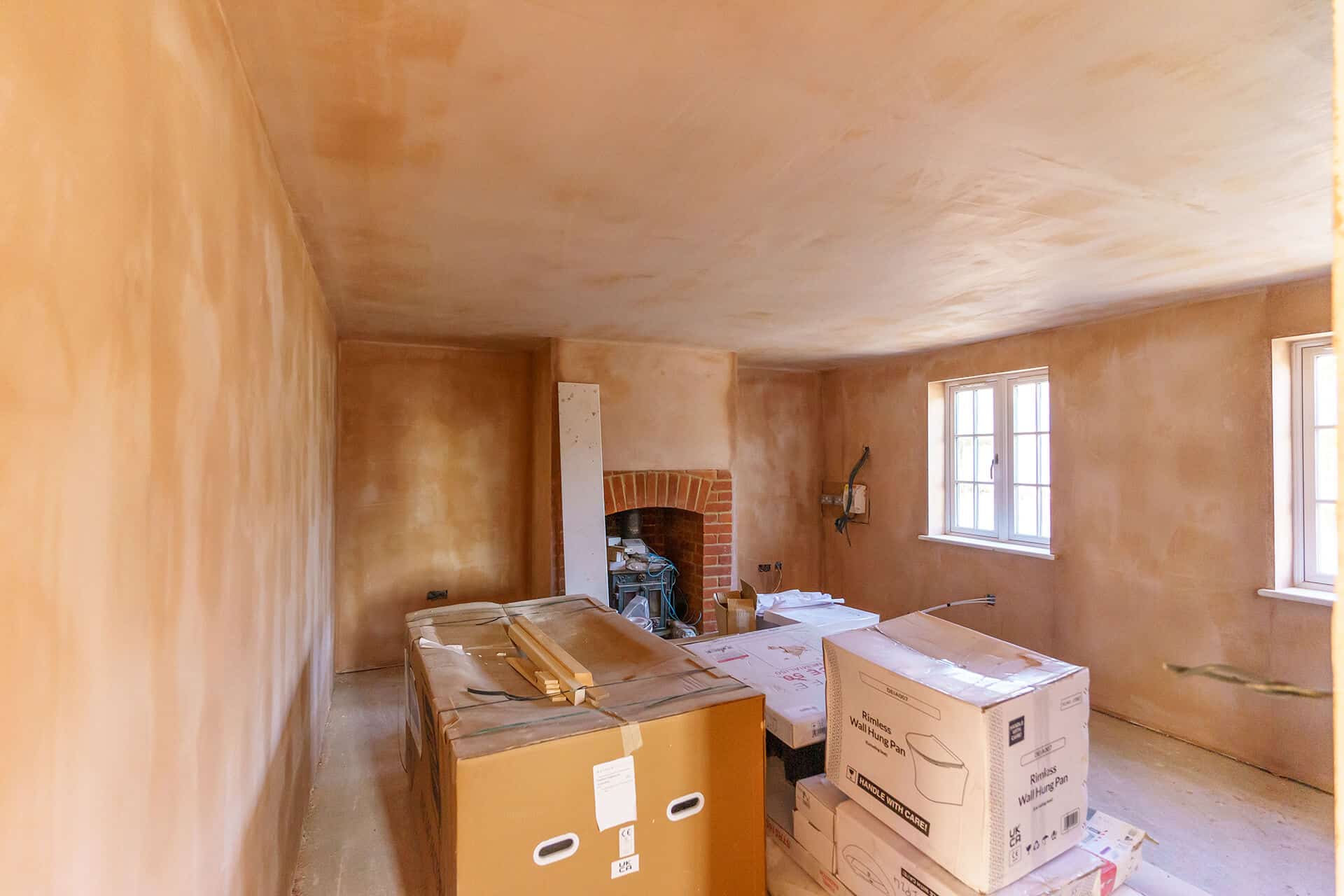 At the point we arrived on site, the foundations, external walls, timber first floor structure, and timber roof structure of the extension had been constructed. After some snagging associated to the elements undertaken by the previous contractor, we were then ready to push on with the remaining scope of works. A high level lift of scaffolding was put in place so we had safe access to the roof, which was closed in using a waterproof membrane and roof tiles that match the existing house. This scaffolding was then altered as we moved down the building, painting the external walls in white to again match the original house. At the same time, we replaced all of the windows and external doors to the property, including a beautiful stained-glass window situated on the staircase.