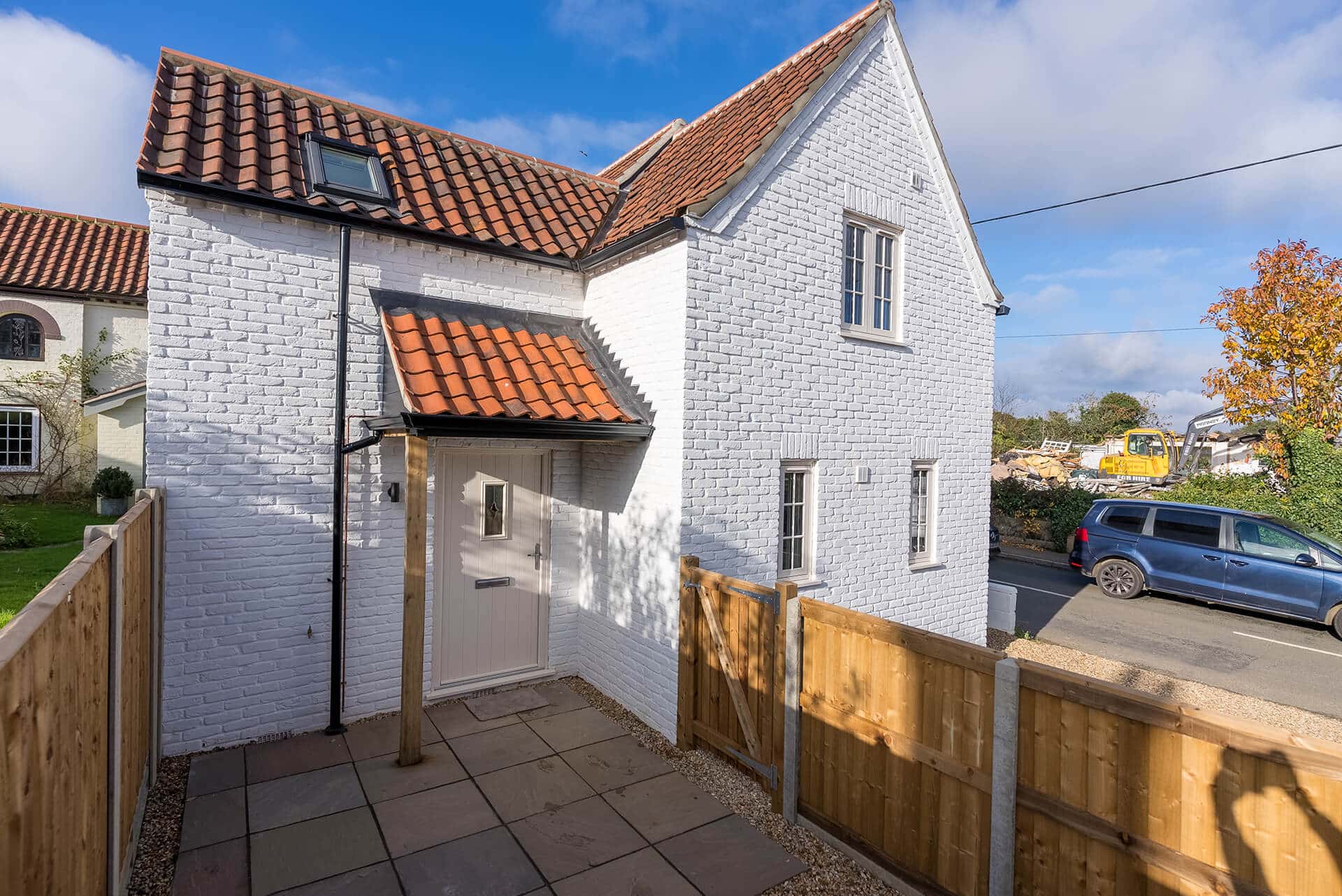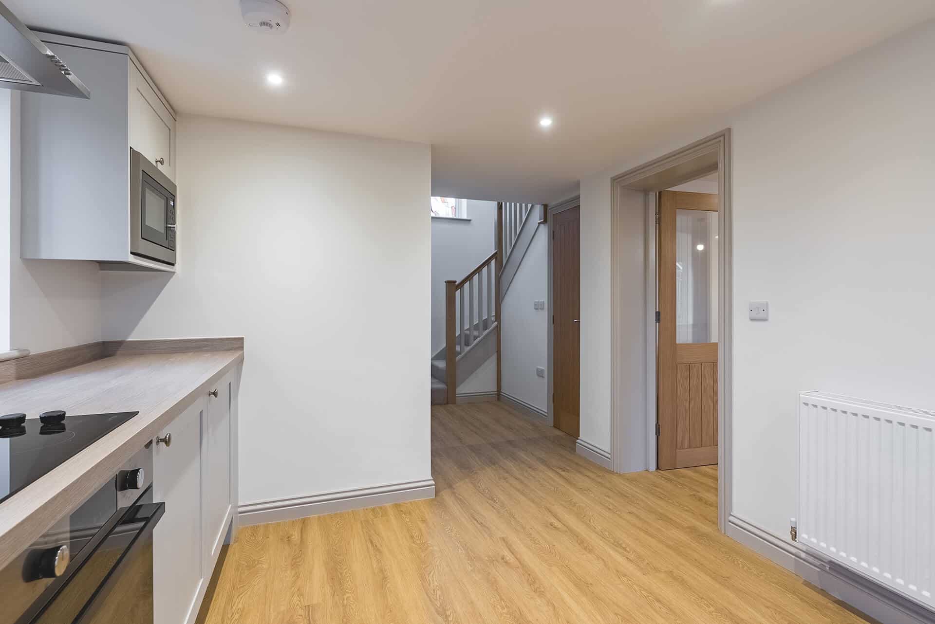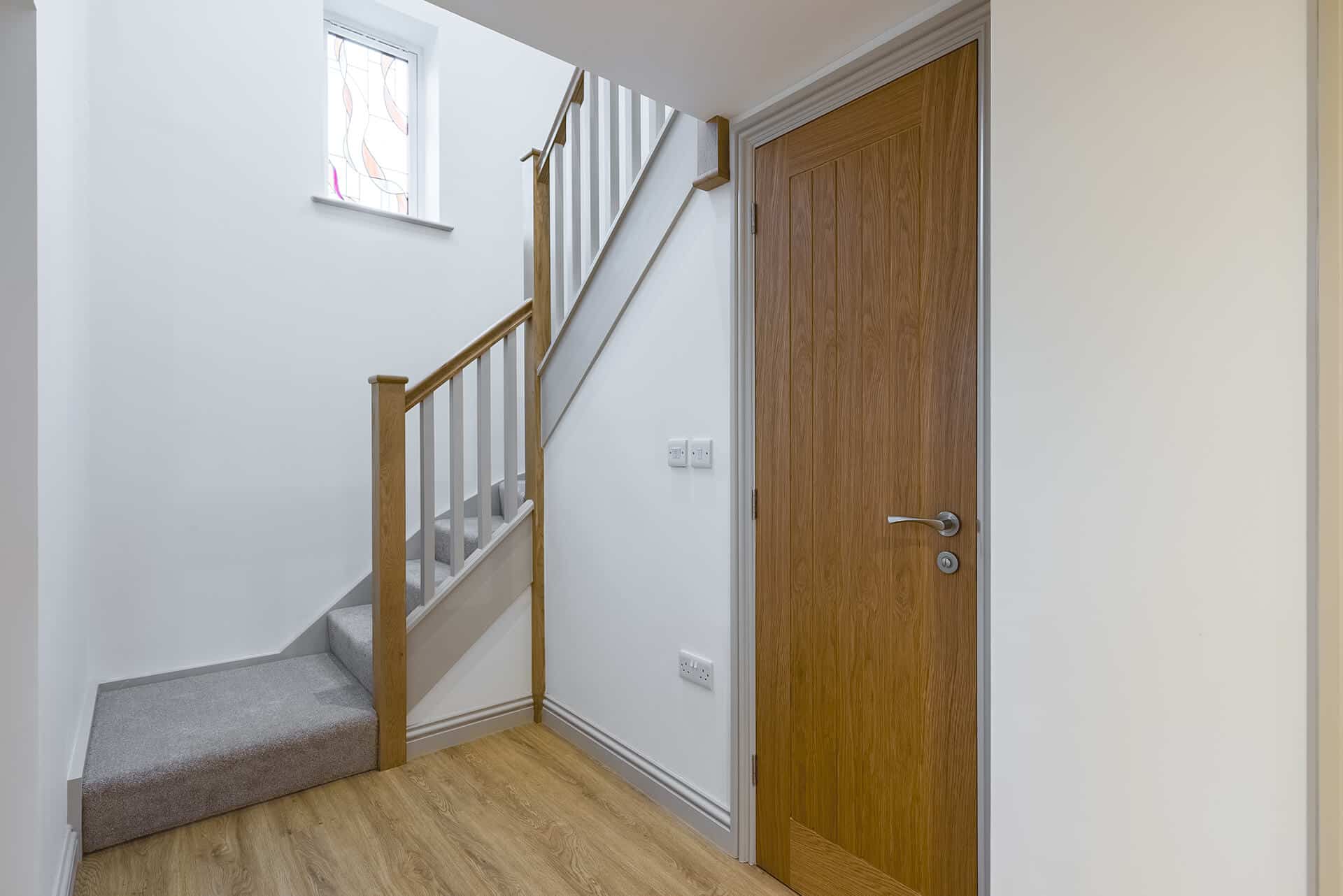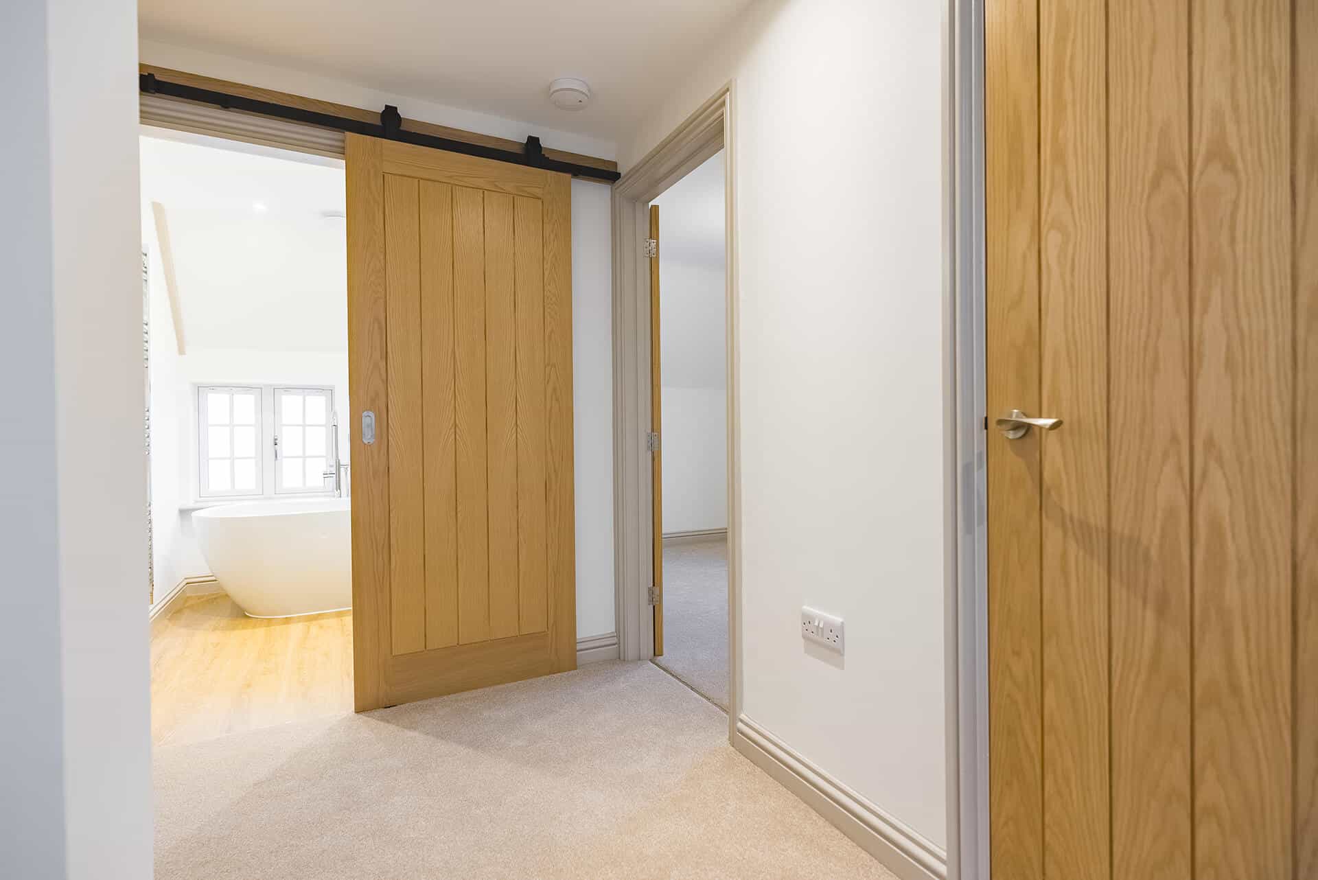 Once the property was closed in and watertight, the scaffolding was struck so we could complete the external fencing and driveway, as well as turning our attention to the internal fit out. The works inside the house are very much what you’d expect to find under modern day building standards. Plasterboard and skim have been used to line and flatten the walls, covered by a variety of finishes including paint and tiles. The internal doors are all pre-finished oak veneer in the very popular ‘cottage’ style, with a feature sliding door on a cast iron track being utilised for the first floor Family Bathroom. The staircase is a softwood construction finished with oak newels, painted spindles, and a full carpet covering. In the Kitchen, shaker style units have been fitted, again a very popular choice amongst customers, topped with an oak-effect laminate worktop and stainless steel accents on the appliances and splashback, giving the Kitchen a slightly more industrial feel as well as being extremely hard wearing. Overall, the location and specification of this property make it the ideal summer hoiliday rental or full time family home.