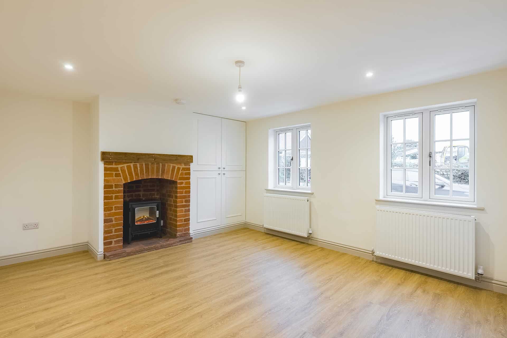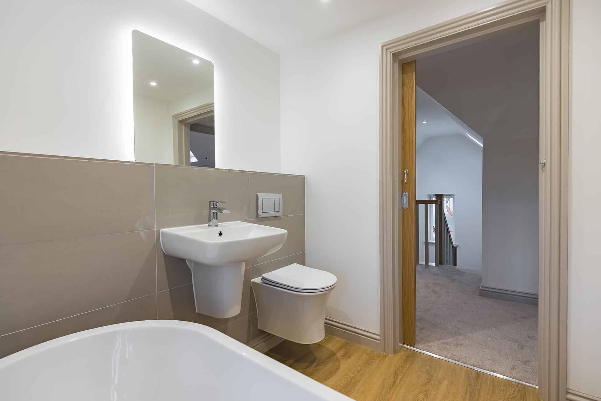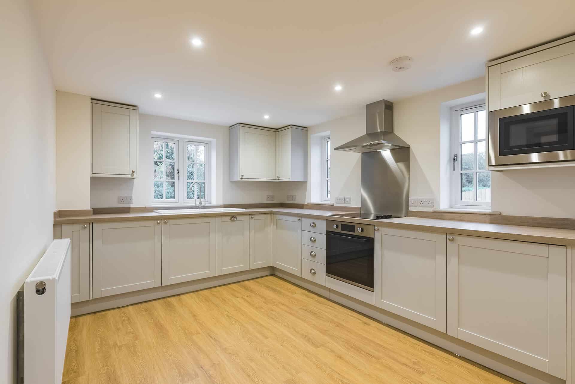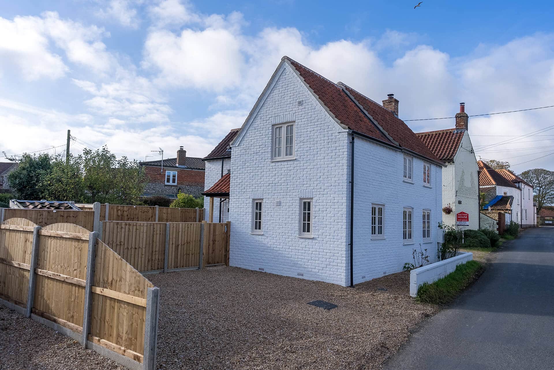 Once the property was closed in and watertight, the scaffolding was struck so we could complete the external fencing and driveway, as well as turning our attention to the internal fit out. The works inside the house are very much what you’d expect to find under modern day building standards. Plasterboard and skim have been used to line and flatten the walls, covered by a variety of finishes including paint and tiles. The internal doors are all pre-finished oak veneer in the very popular ‘cottage’ style, with a feature sliding door on a cast iron track being utilised for the first floor Family Bathroom. The staircase is a softwood construction finished with oak newels, painted spindles, and a full carpet covering. In the Kitchen, shaker style units have been fitted, again a very popular choice amongst customers, topped with an oak-effect laminate worktop and stainless steel accents on the appliances and splashback, giving the Kitchen a slightly more industrial feel as well as being extremely hard wearing. Overall, the location and specification of this property make it the ideal summer hoiliday rental or full time family home.