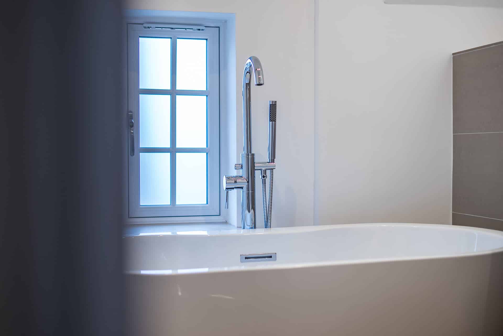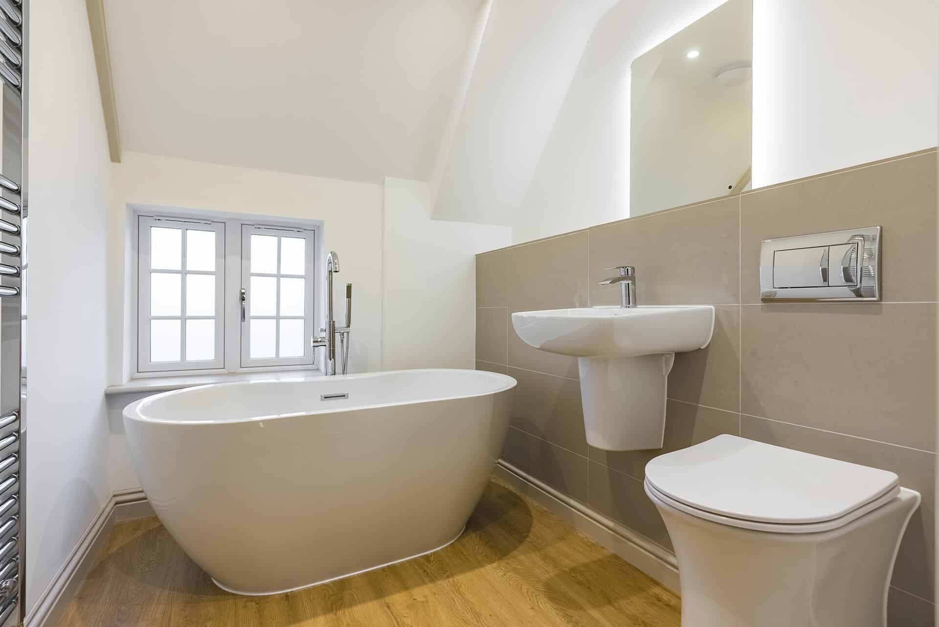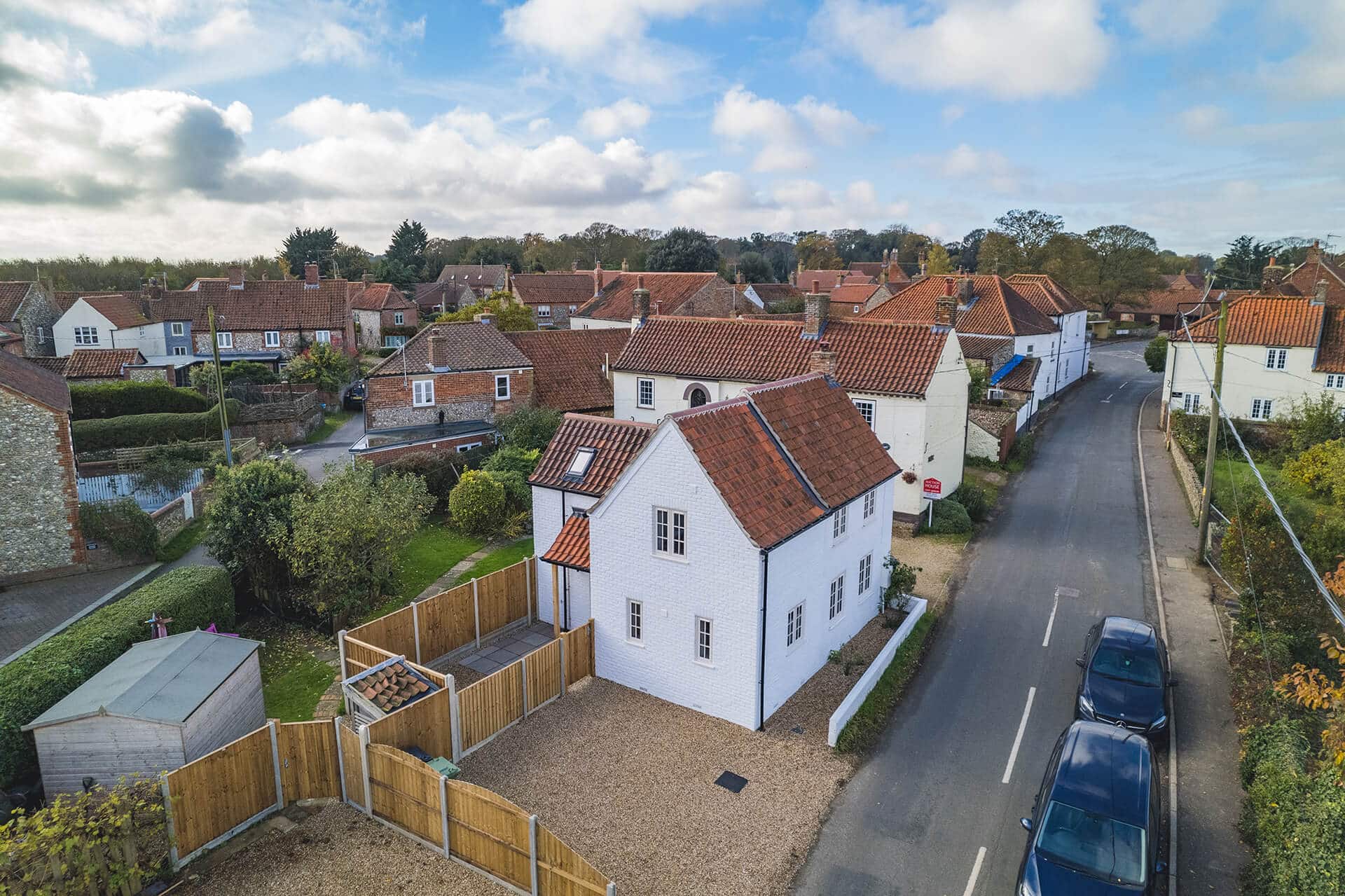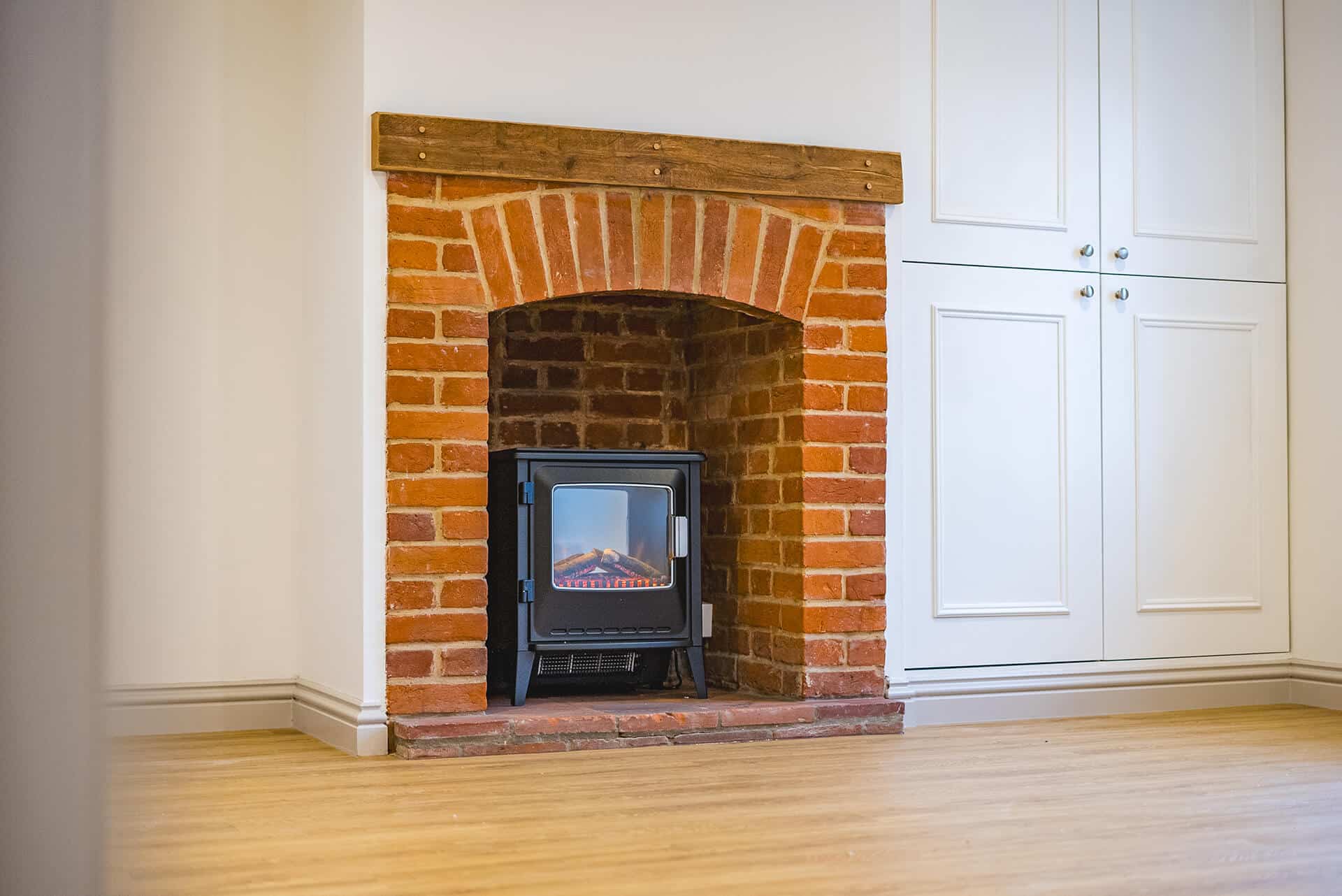 Once the property was closed in and watertight, the scaffolding was struck so we could complete the external fencing and driveway, as well as turning our attention to the internal fit out. The works inside the house are very much what you’d expect to find under modern day building standards. Plasterboard and skim have been used to line and flatten the walls, covered by a variety of finishes including paint and tiles. The internal doors are all pre-finished oak veneer in the very popular ‘cottage’ style, with a feature sliding door on a cast iron track being utilised for the first floor Family Bathroom. The staircase is a softwood construction finished with oak newels, painted spindles, and a full carpet covering. In the Kitchen, shaker style units have been fitted, again a very popular choice amongst customers, topped with an oak-effect laminate worktop and stainless steel accents on the appliances and splashback, giving the Kitchen a slightly more industrial feel as well as being extremely hard wearing. Overall, the location and specification of this property make it the ideal summer hoiliday rental or full time family home.