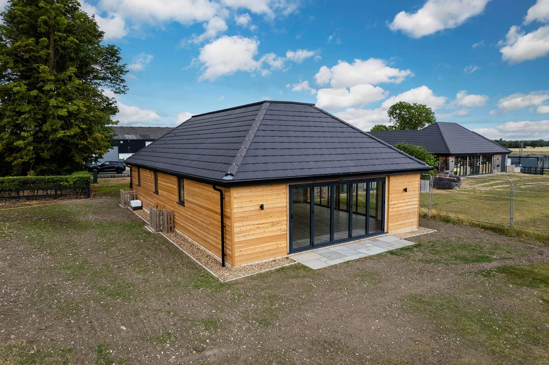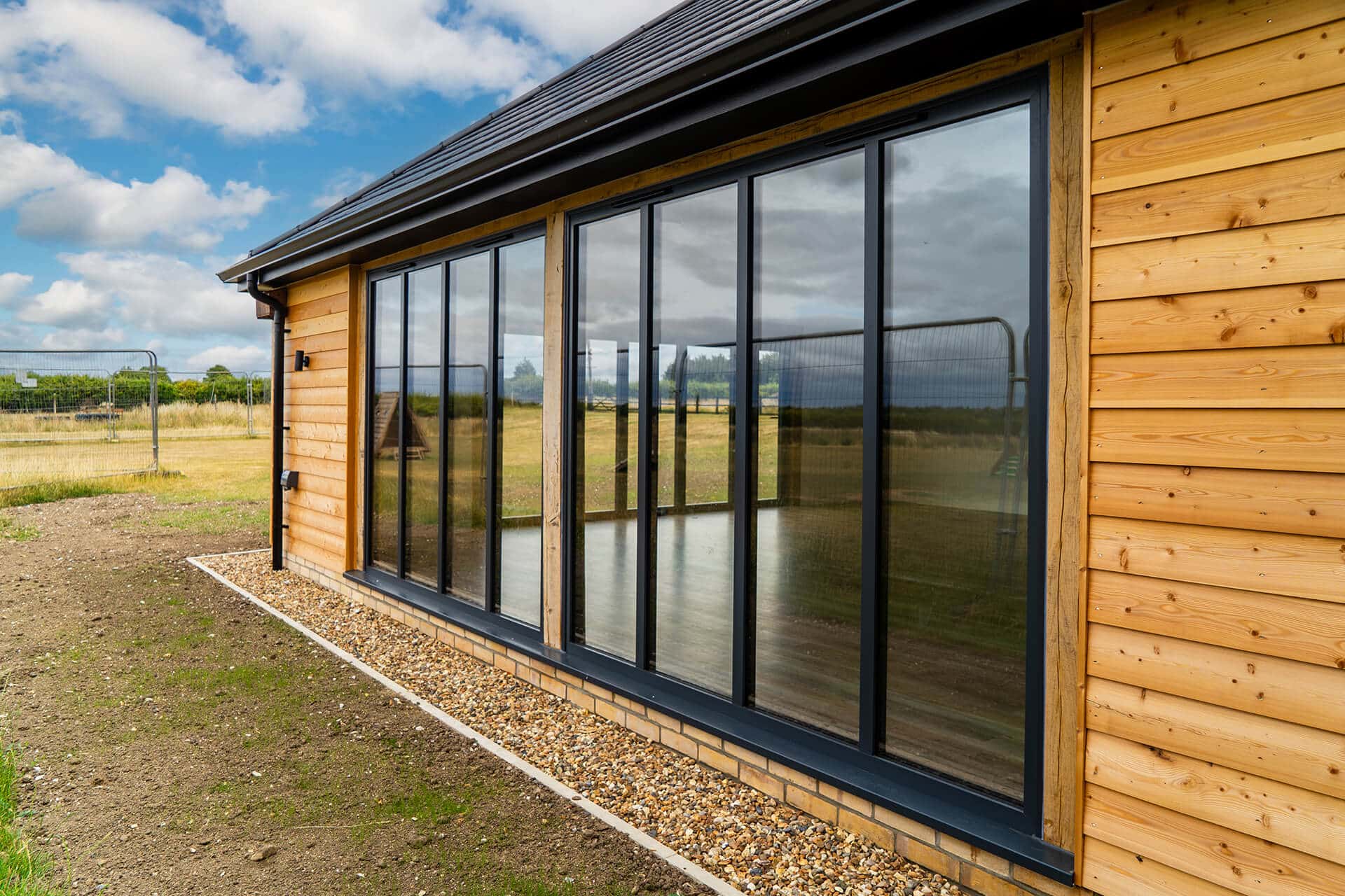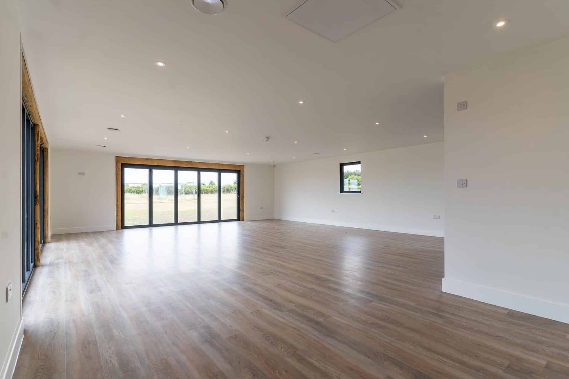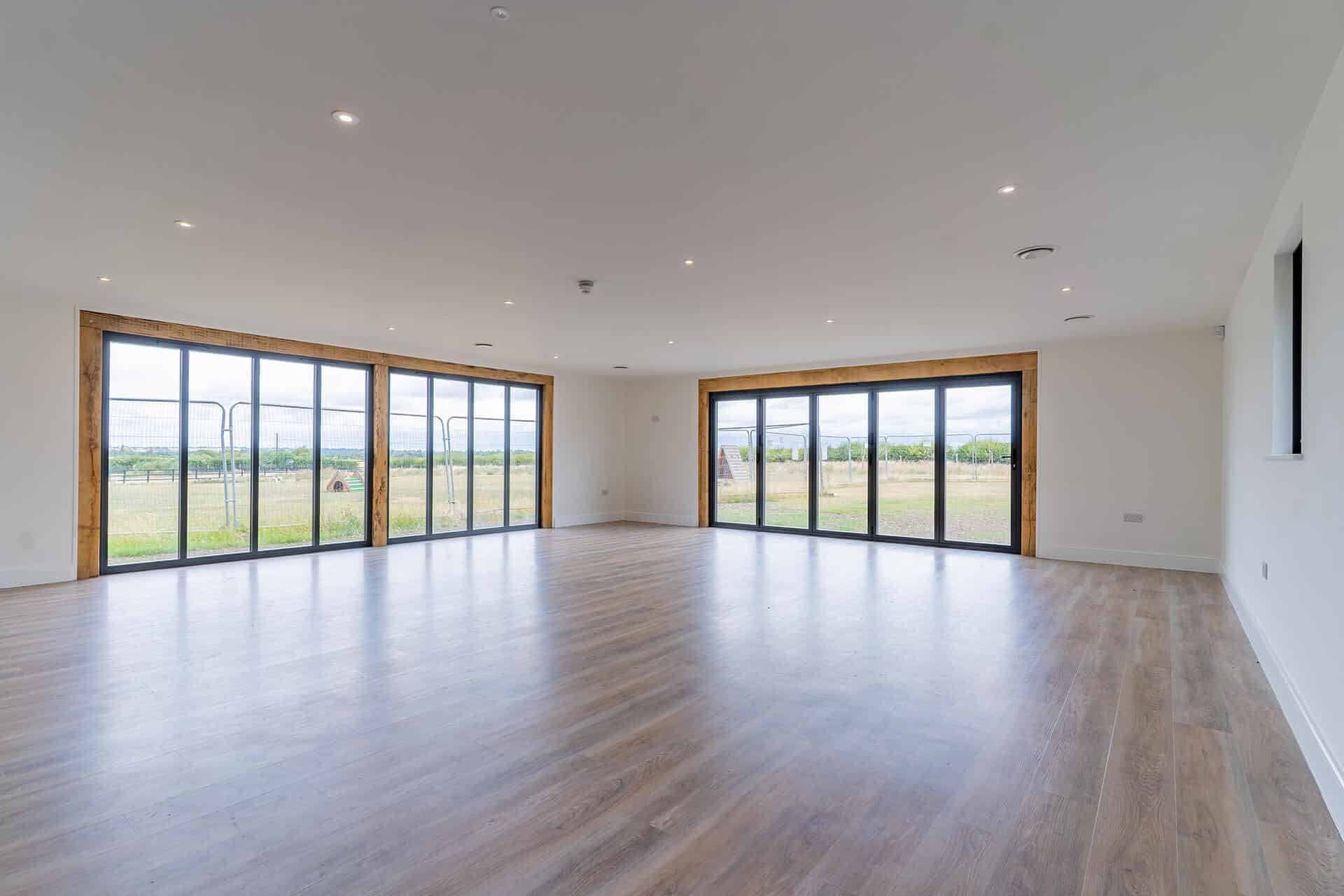 The structure of the extension is quite straight forward. Strip foundations were dug & poured in concrete before an insulated floor slab was installed. Two-skin masonry carries the building up to the damp proof course level before a structural timber frame forms the external walls and roof. The walls are clad in timber larch and the roof is covered with slate roof tiles, both specified to match the existing building. Likewise, the windows are anthracite grey uPVC and the full height screens and bi-folding doors are anthracite grey aluminium. These provide a great influx of natural light into the space, especially in the warmer months of the year. Around these fixtures are feature oak posts and beams, which provide structural support as well as adding a premium feature to the building.