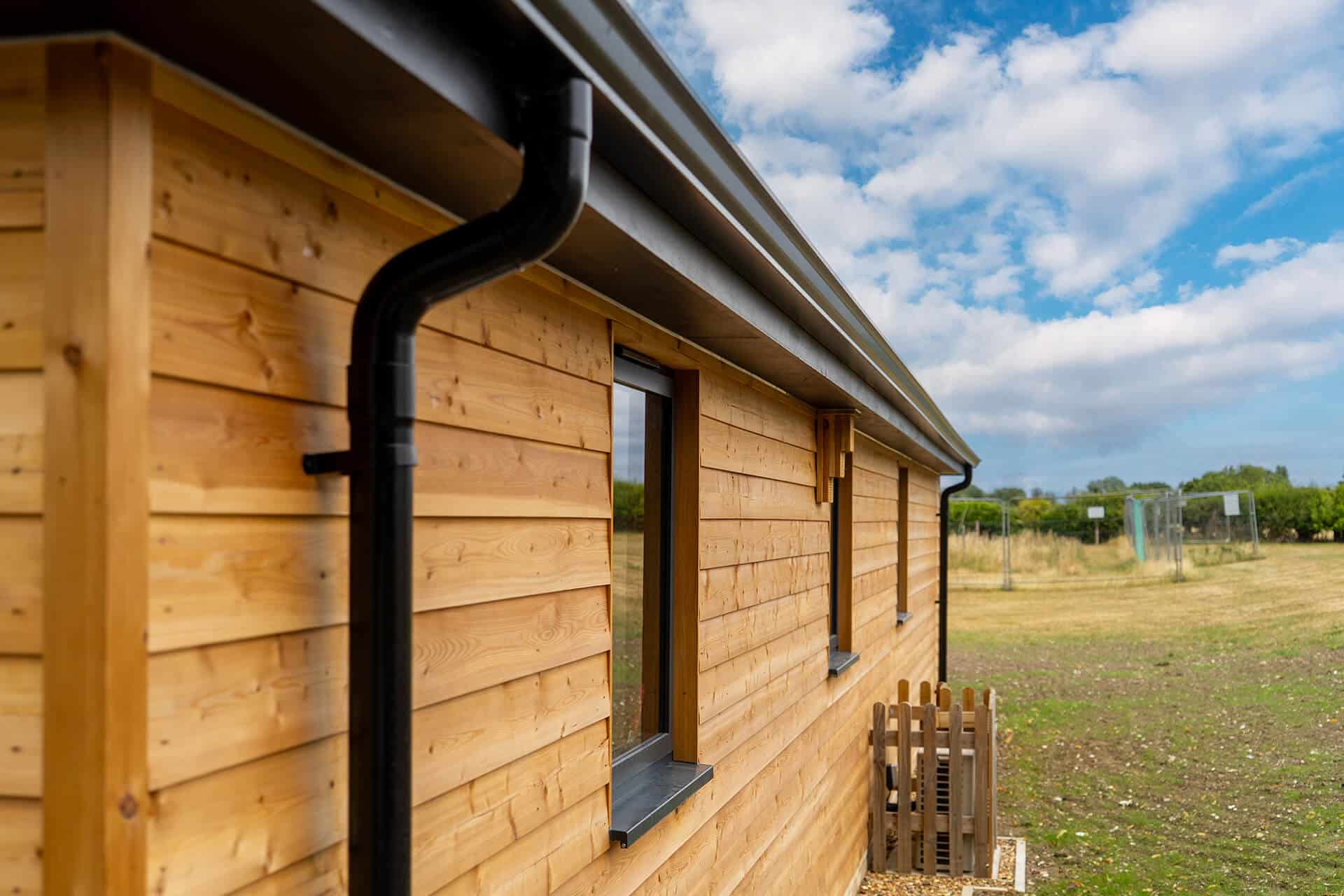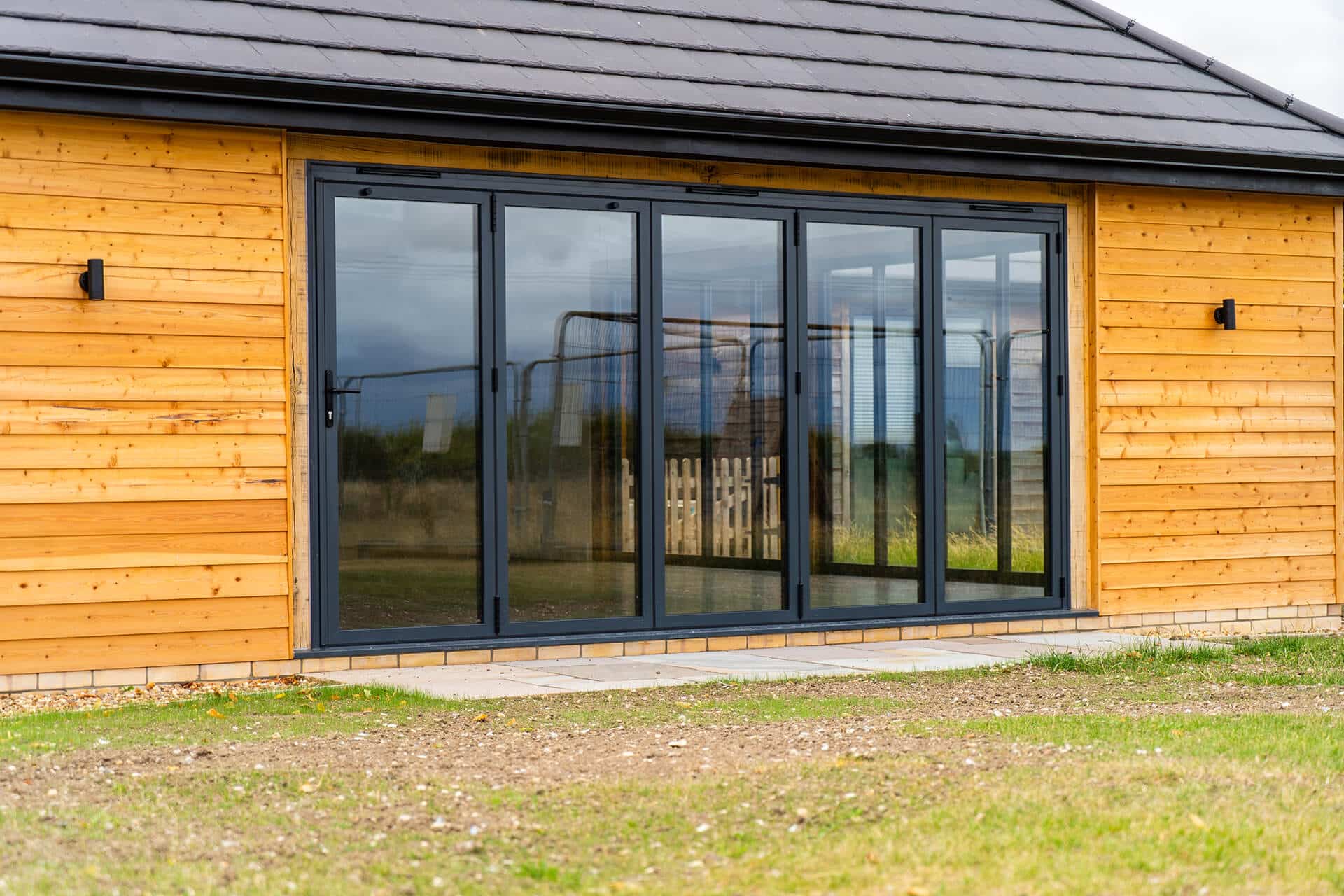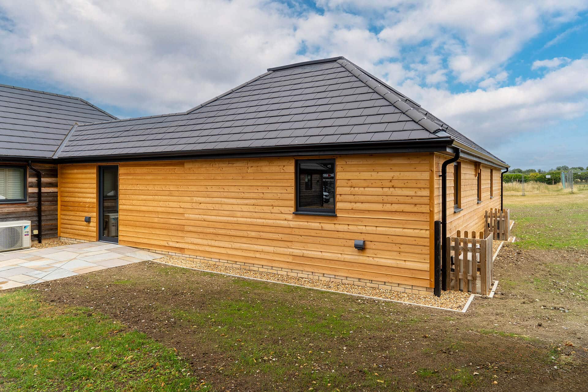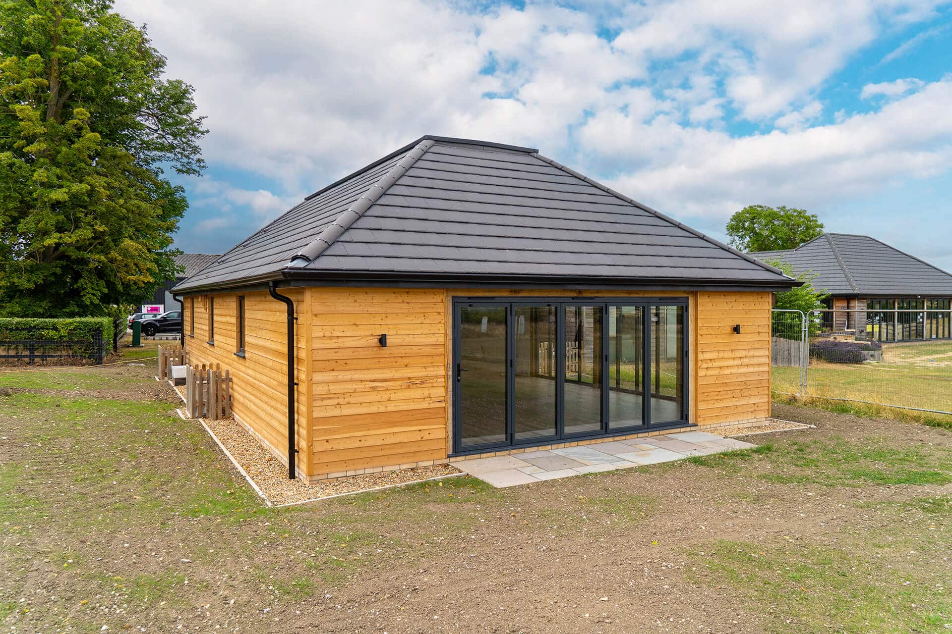 The structure of the extension is quite straight forward. Strip foundations were dug & poured in concrete before an insulated floor slab was installed. Two-skin masonry carries the building up to the damp proof course level before a structural timber frame forms the external walls and roof. The walls are clad in timber larch and the roof is covered with slate roof tiles, both specified to match the existing building. Likewise, the windows are anthracite grey uPVC and the full height screens and bi-folding doors are anthracite grey aluminium. These provide a great influx of natural light into the space, especially in the warmer months of the year. Around these fixtures are feature oak posts and beams, which provide structural support as well as adding a premium feature to the building.