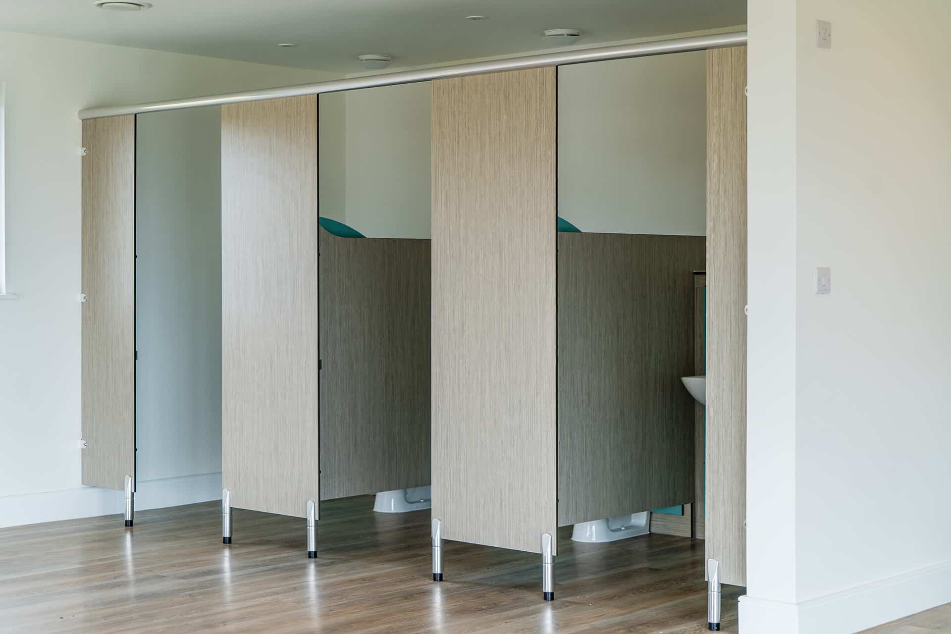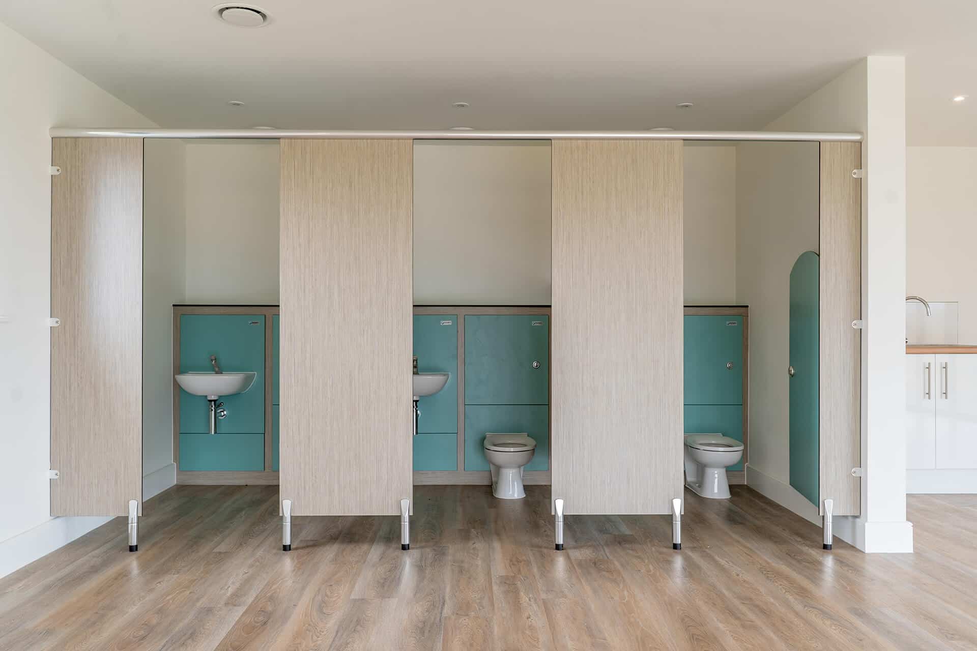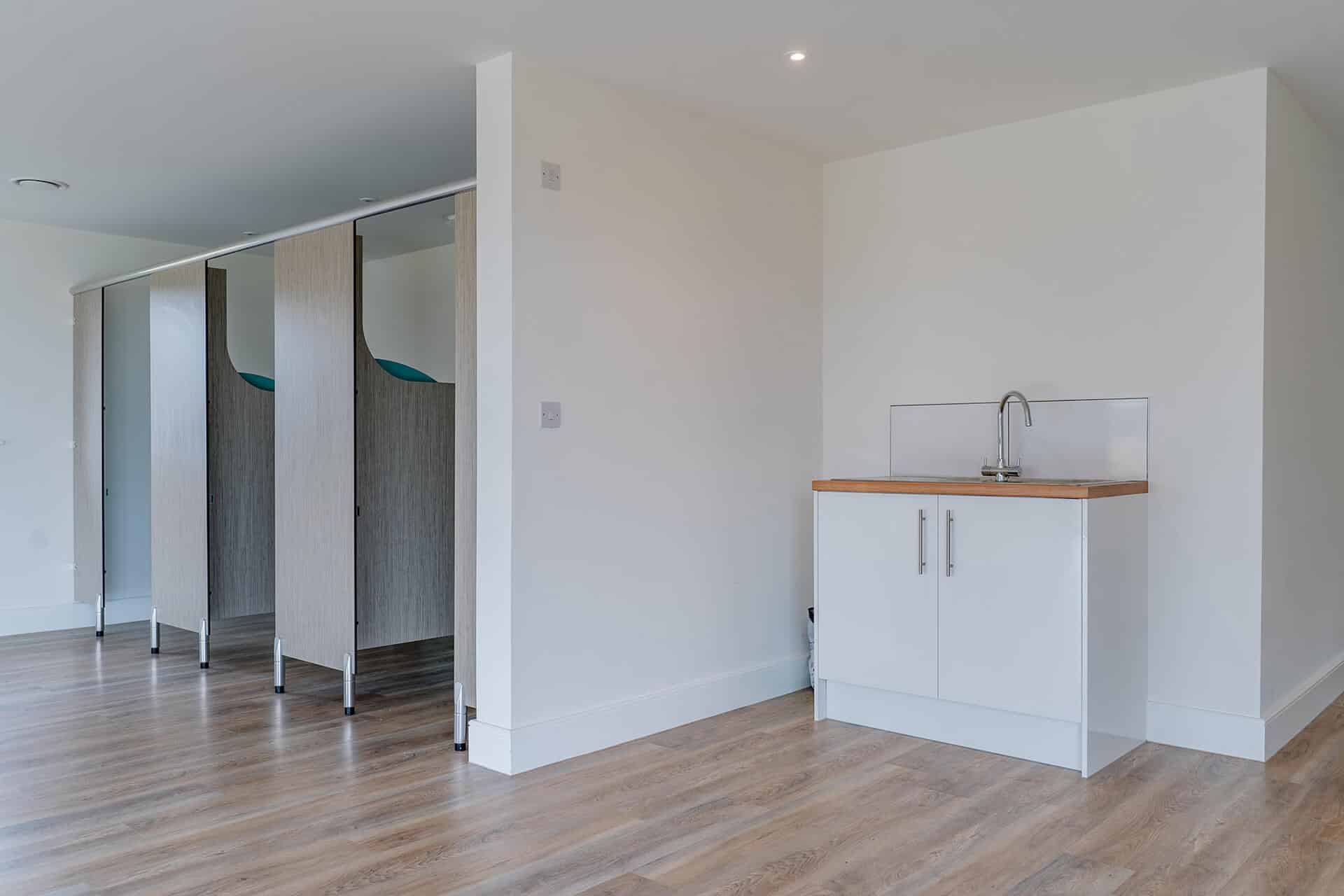 Internally, the walls and ceilings have been lined with plasterboard, plaster skim, and bright white paint, which reflects the natural light that comes in via the aluminium screens and doors. The toilet cubicles have been specialist designed for use by 3-5-year-old children, with the sanitaryware set at a lower height than the equivalent for adults. The cubicle doors are also shorter, which enables supervisors to assist any children that may need it, whilst also providing adequate privacy for those children while they use the facilities. In terms of the other features within the new extension, we’ve installed a small washing up station for clean up after painting and other activities, and formed a Staff Room behind the toilet cubicles for supervisors to use while they are on break.