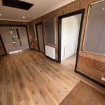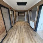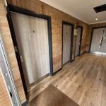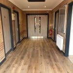 Slightly smaller in scope than Phase 1, in the Lobby we overboarded the existing Artex patterned ceiling, installing new plasterboard and skim to give it a smooth and modern finish. The old brown wood doors were all replaced with grey oak foil doors, with finger trap guards installed to the areas where children may be operating the doors. Plastic architrave and skirting has been used to the perimeter of the room and doors to reduce the redecorating requirements, and the antharcite grey colour was chosen to keep up to speed with current trends. Finally, after removing the old floor boards, we’ve installed a new commercial luxury vinyl tile floor covering finished in a textured oak effect. This choice of flooring is cheaper compared to the genuine wood equivalents, requires less maintenance, and tends to last longer in high traffic areas, making it ideal for this application.
