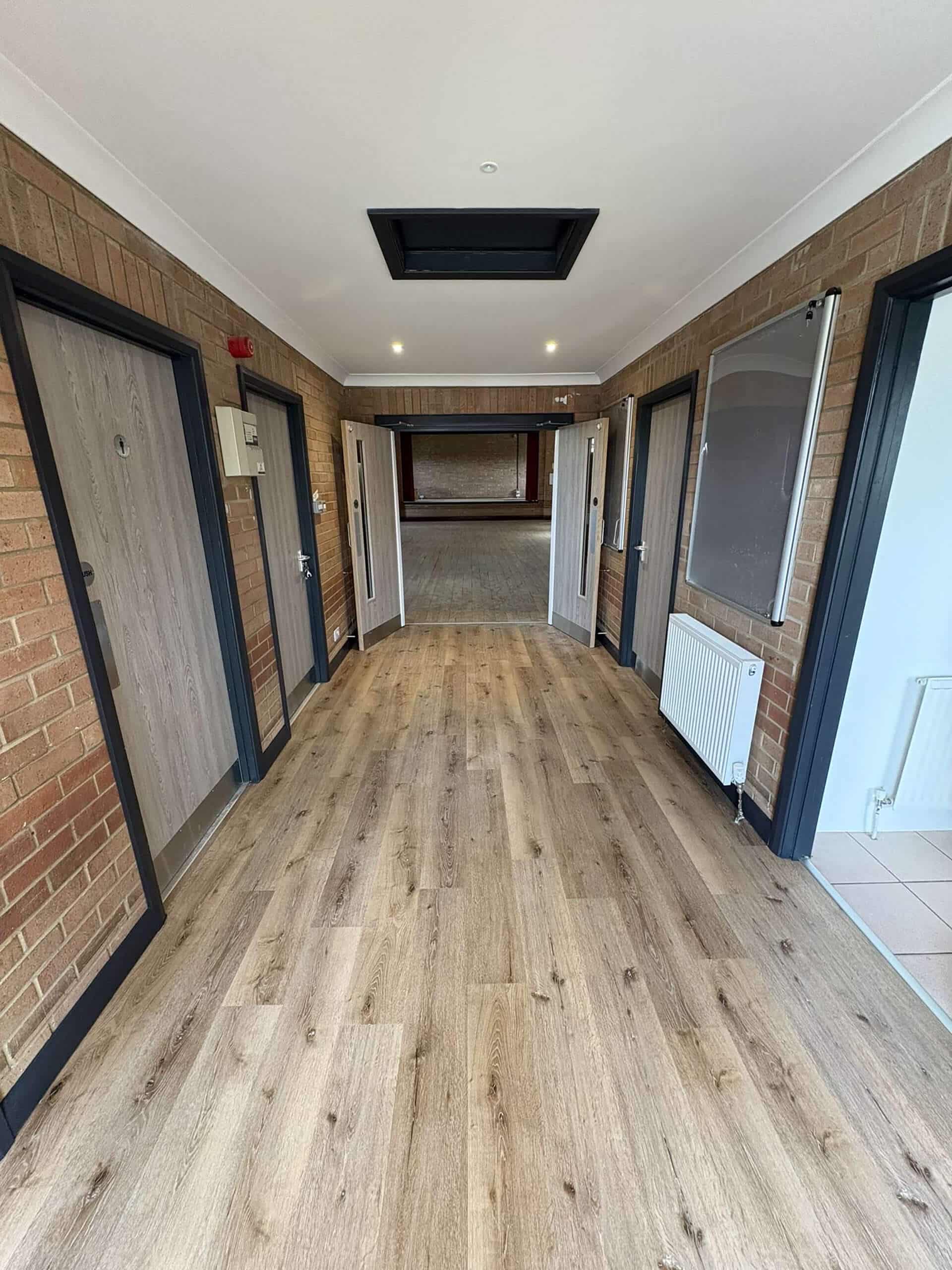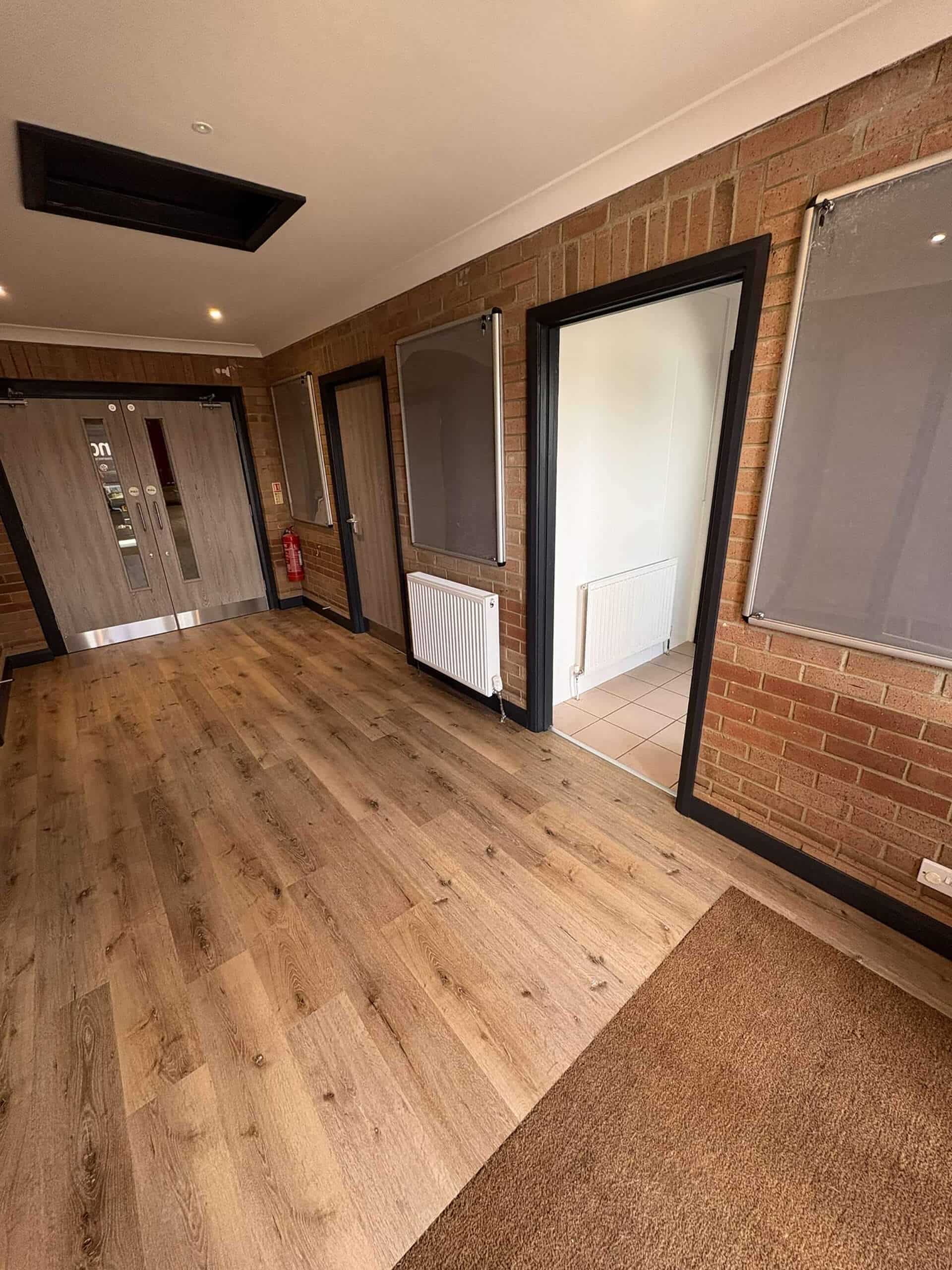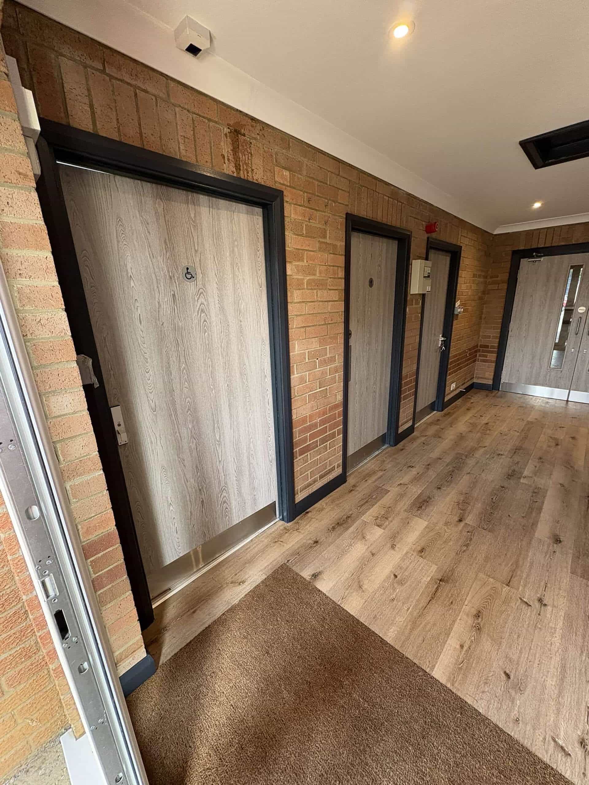 Slightly smaller in scope than Phase 1, in the Lobby we overboarded the existing Artex patterned ceiling, installing new plasterboard and skim to give it a smooth and modern finish. The old brown wood doors were all replaced with grey oak foil doors, with finger trap guards installed to the areas where children may be operating the doors. Plastic architrave and skirting has been used to the perimeter of the room and doors to reduce the redecorating requirements, and the antharcite grey colour was chosen to keep up to speed with current trends. Finally, after removing the old floor boards, we’ve installed a new commercial luxury vinyl tile floor covering finished in a textured oak effect. This choice of flooring is cheaper compared to the genuine wood equivalents, requires less maintenance, and tends to last longer in high traffic areas, making it ideal for this application.