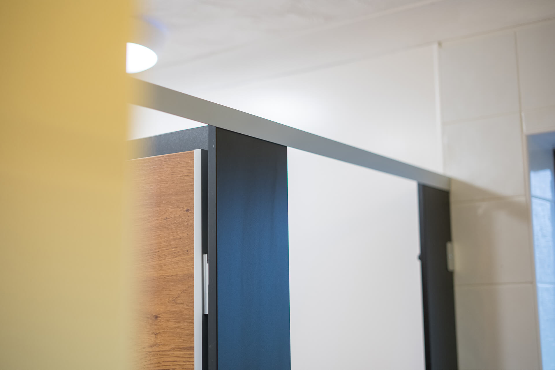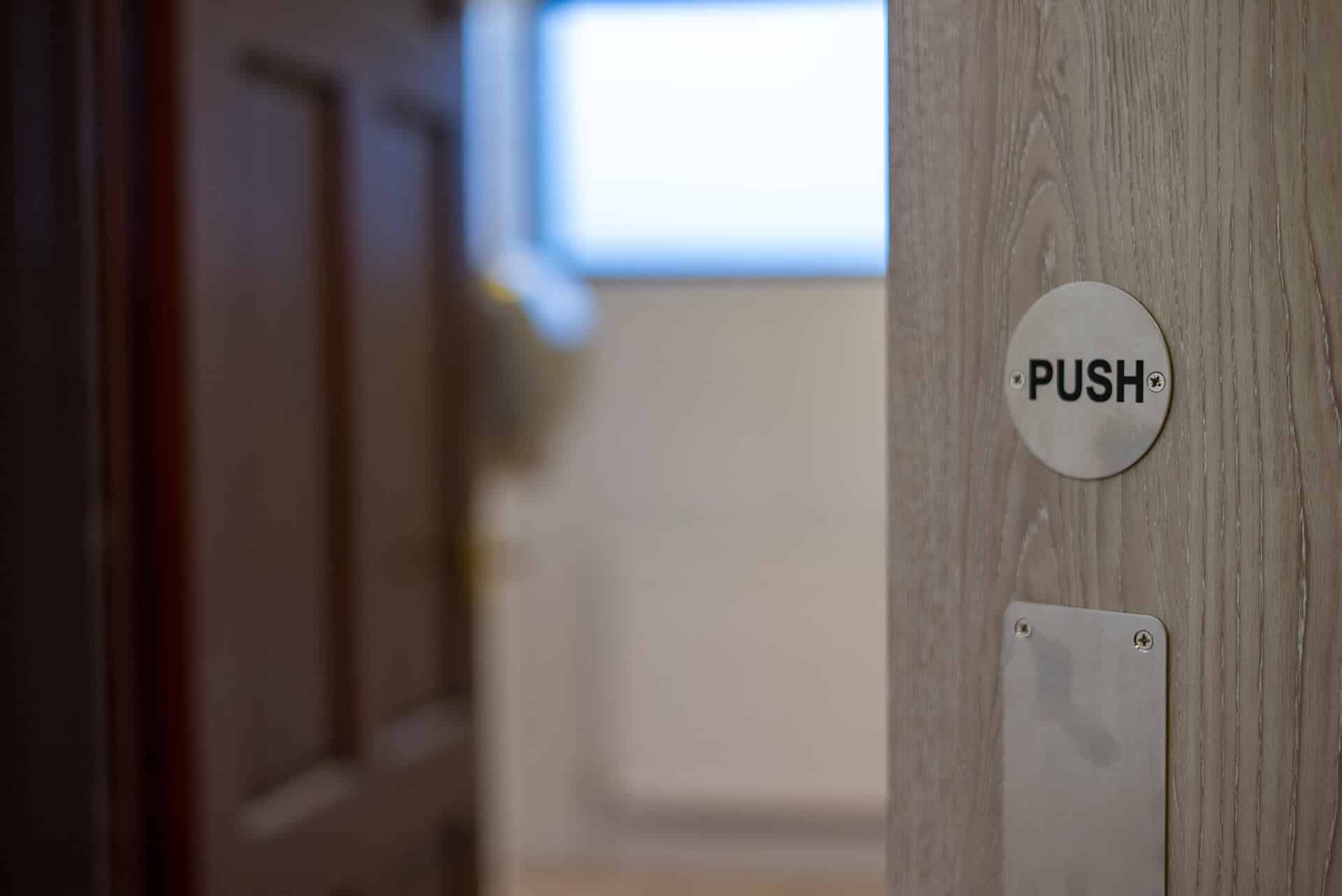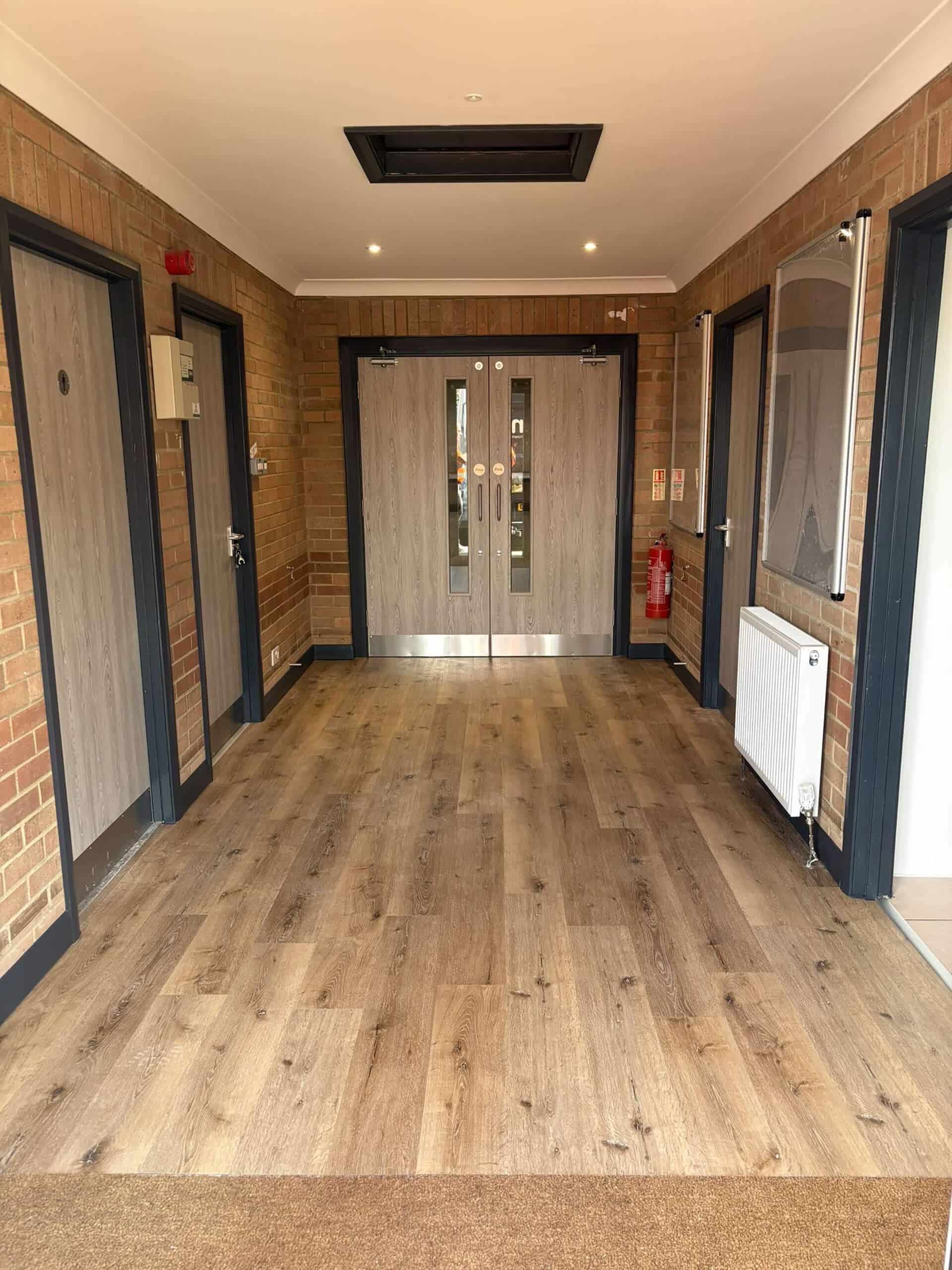 Slightly smaller in scope than Phase 1, in the Lobby we overboarded the existing Artex patterned ceiling, installing new plasterboard and skim to give it a smooth and modern finish. The old brown wood doors were all replaced with grey oak foil doors, with finger trap guards installed to the areas where children may be operating the doors. Plastic architrave and skirting has been used to the perimeter of the room and doors to reduce the redecorating requirements, and the antharcite grey colour was chosen to keep up to speed with current trends. Finally, after removing the old floor boards, we’ve installed a new commercial luxury vinyl tile floor covering finished in a textured oak effect. This choice of flooring is cheaper compared to the genuine wood equivalents, requires less maintenance, and tends to last longer in high traffic areas, making it ideal for this application.