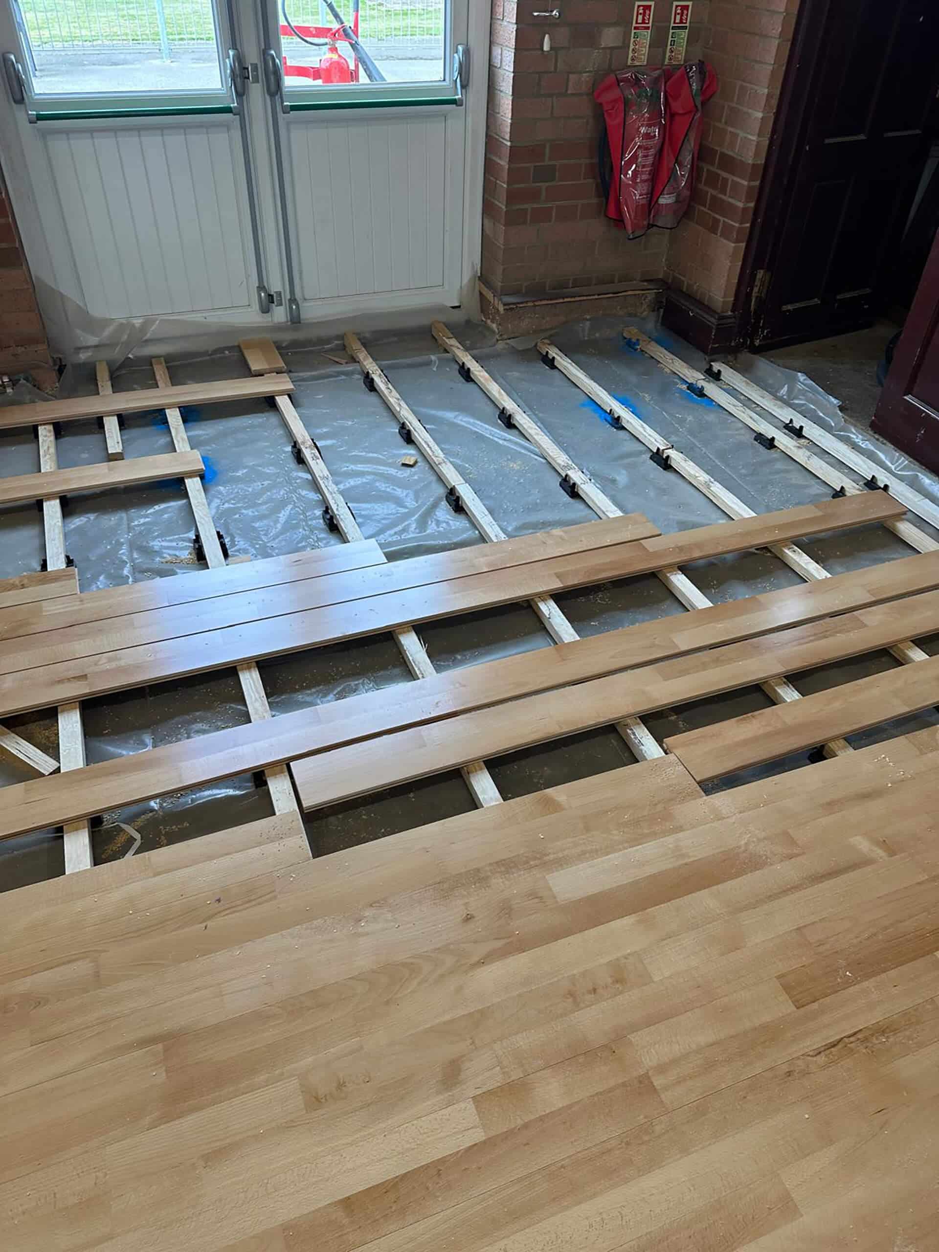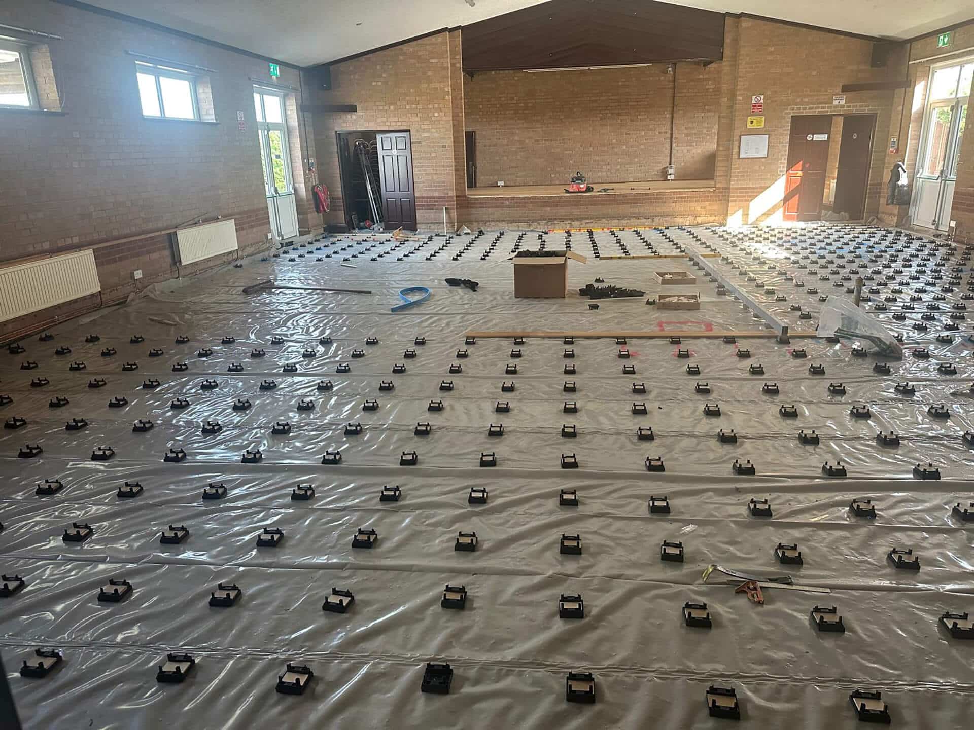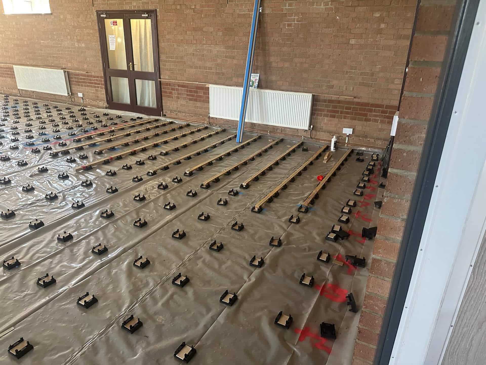 The challenge with this phase was the required specification for the flooring, arising from it needing to be suitable to have dance lessons on. In short, a dance floor needs to have an element of ‘spring’ to it, as to assist students with jumps and lifts while they practice and perform. To create this spring you need a specially designed floor build up. After removing the existing floor and giving the area a good clean we laid a damp proof membrane which will protect the new floor from any rising damp or moisture. Over the membrane, adjustable levelling cradles were set out at regular intervals and checked with a laser to ensure they all had the same finishing height, this would reassure us that our new floor was going to be perfectly level. On top of the cradles are timber battens with a layer of foam on the backing, and it is this foam that contracts and expands under impact, giving the floor its sprung nature. Finally, the premium hardwood floor covering was fixed over the battens before plastic skirting was installed to the perimeter of the Hall.